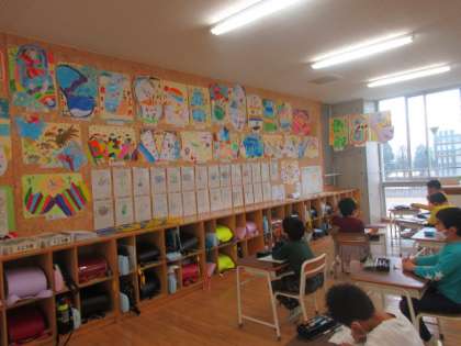 図画工作科の学習では「ふしぎなたまご」を描きました。友達と作品を見合いながら、「たまごから何がうまれているのかな」「色の使い方が上手だな」と話すなど楽しく鑑賞しています。