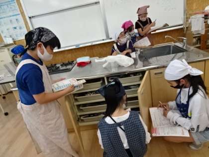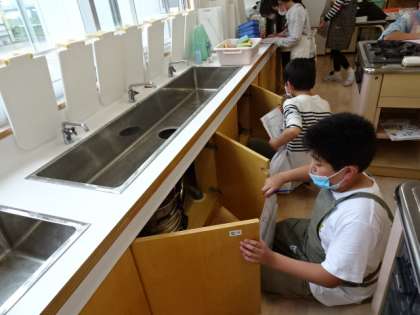 お茶をいれる実習と片付けを終えた後、家庭科室の様々な調理器具の場所や使い方について調べました。次の実習も楽しみにしている様子でした。