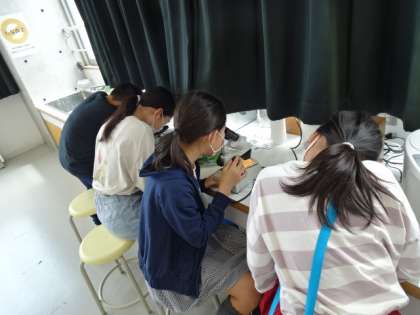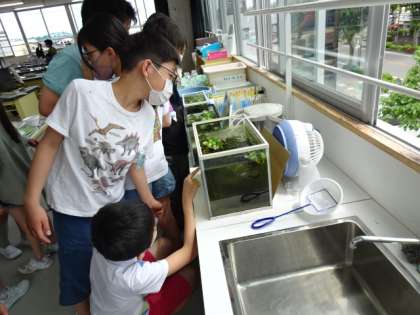 メダカの卵が産まれ、心臓が動くようになったと聞いて、子供たちはどんな様子か楽しみにして顕微鏡をのぞいたり、水槽を見たりしていました。成長の様子を進んでノートに記録していました。