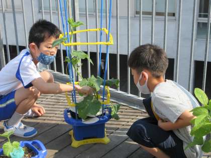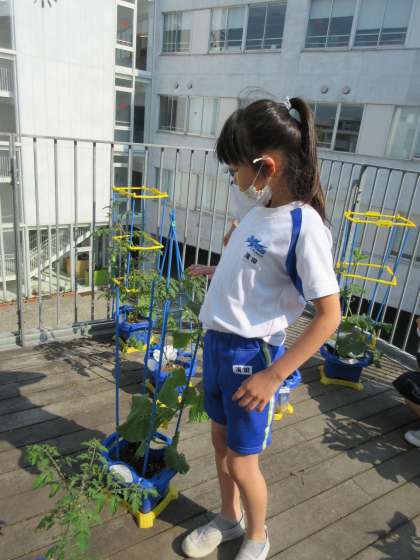 子供達は、毎日野菜のお世話をがんばっています。その中で、「花が咲いたよ。」「私の腰くらいまで大きくなった。」とたくさんの成長に気づいて、とても嬉しそうでした。