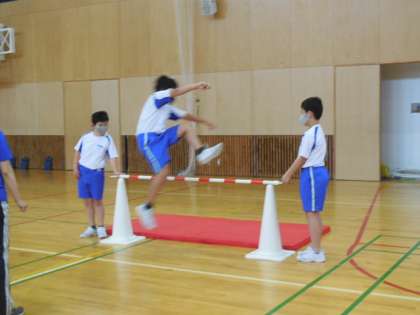 体育館で高跳びの学習をしました。クロームブックを使って動画を撮り、足の振り上げ方やフォームを確認しながら練習しました。