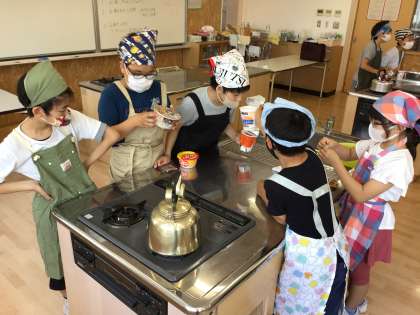 家庭科の学習を生かして、お弁当と一緒に温かい麺類やスープを食べました。