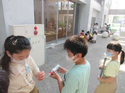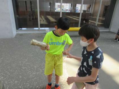 ジェットボトルの修理をしました。芝園小学校のみんながこれからも気持ちよくジェットボトルができるように、ペットボトルの色つけや取り付けをていねいに行いました。休み時間には、低学年の子供たちが新しくなったジェットボトルを楽しむ姿を見て、うれしそうにする4年生の子供たちの姿がみられました。