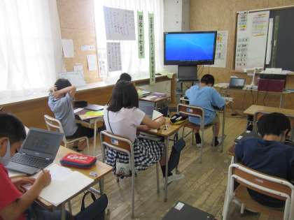 国語科「日常を十七音で」では、季節を表す言葉を入れながら、五・七・五の十七音で生活の中で気づいたことや、驚いたことなどを俳句にして伝えています。言葉の順序を工夫したり、たとえを使ったりしながら表現を工夫しています。