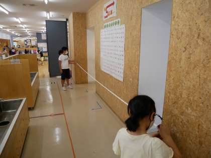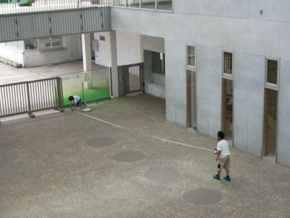 算数では長さの学習をしています。今日はグループでまきじゃくを使って校内の様々な長い長さを測りました。