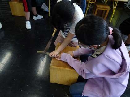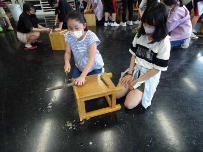 明日の立山青少年自然の家での活動に向けて、のこぎりで枝を切りました。マイフォーク、マイスプーンを作るために、自分の好みの大きさにしました。