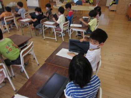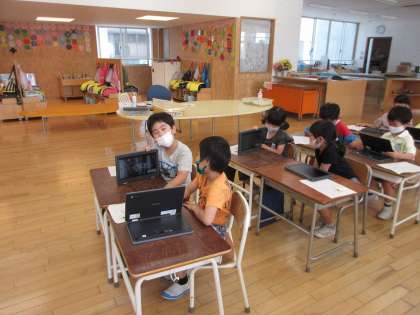 国語の「くちばし」の教材文をお手本にして、「生き物クイズ作り」に挑戦しています。クロームブックの写真機能を使って、図鑑の写真を取り込み、生き物の一部分をアップにして「これは、なんの○○でしょう?」とペアの友達にクイズを試しています。学級で行う「生き物クイズ大会」に向け、生き物の特徴がわかるクイズをめざして自分の作ったクイズを何度も見直しています。