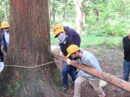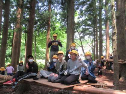 班の友達と協力して丸太を運んだり、木に縄で結びつけたりしました。だんだんと床ができてきました。
