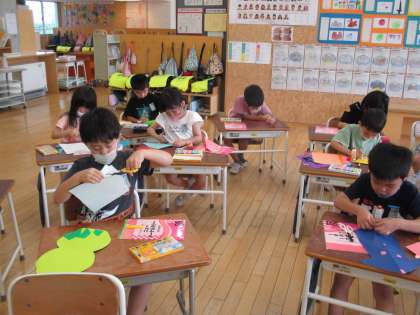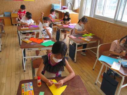 折って立てた紙を見て、想像したものを作りました。子供たちは、豊かな発想力で、家や電車、動物、扇風機、花壇などを作り、すてきな作品に仕上がりました。