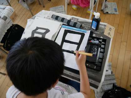 「日」を折れに気を付けて清書しました。どうしたら手本のような折れの形になるのか、筆の動かし方を考えながら書いていました。