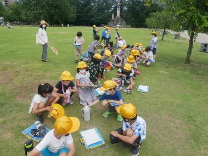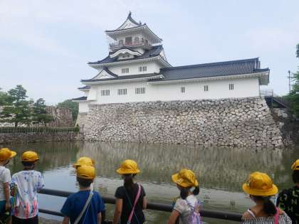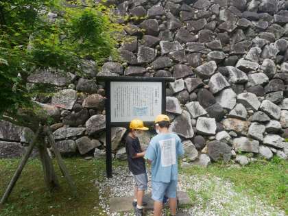ユウタウンから城址公園に向かいました。富山城の周りにある壁の石の積み方の看板などを見て様々なことを調べようとしている子供たちでした。