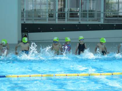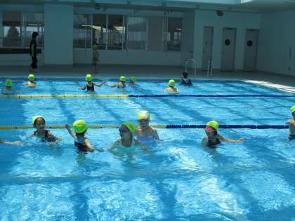 1年生は、初めての水泳学習を行いました。子供たちは水の中を歩いたり、顔を付けたりして、子供たちは水に親しみました。