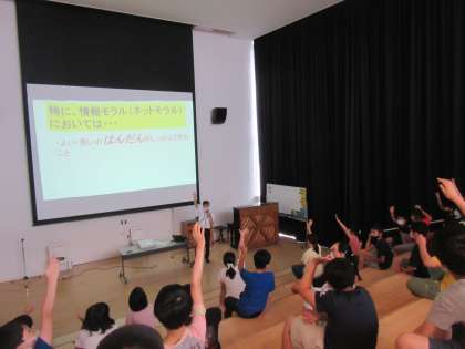 5年生では、情報モラル講座を行いました。ネットを使うよさや便利さだけでなく、利用していく際に気をつけることや意識していくことについて分かりやすく教えていただきました。子供たちは、自分も相手も安全にネットを利用できるように、情報の取り扱いに注意したり、情報を正しく判断したりしていきたいと話していました。
