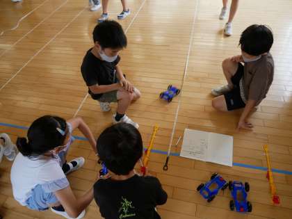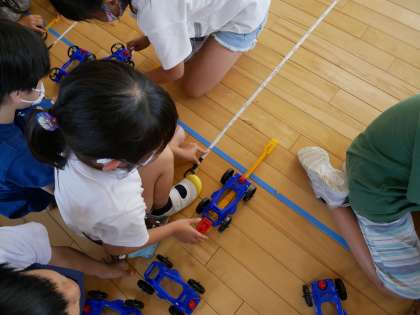 風に引き続きゴムでも実験をしました。ゴムののびによって動き方が変わるのか、実験のキットで試し、違いに気付いていました。