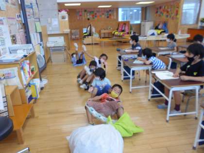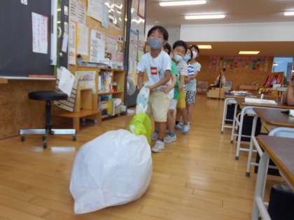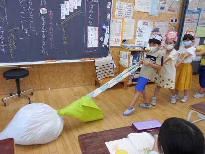 国語科では「おおきなかぶ」の学習をしています。「リズムよく音読しよう・役になりきろう」をめあてに音読発表会に向けて練習しています。「うんとこしょ。どっこいしょ。」と息をそろえてかぶを引っ張ったり、かぶが抜ける場面では尻餅をついたりして、大きなかぶのお話の面白さを身体いっぱいで表現しています。