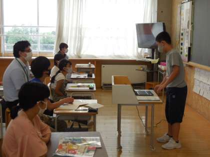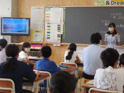 ALTの先生やクラスの友達に、おすすめの国を英語で紹介しました。「有名な建物を見ることができるよ」「おいしい物を食べることができるよ」など、習った表現を生かしながら紹介することができました。