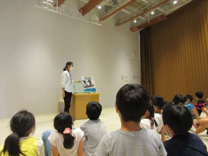 図書館では、図書館の利用の仕方を聞いたり、読み聞かせをしていただきました。「ホットケーキ」というお話を本を見ずに聞いて想像したり、大型絵本「くじらだ」を見せていただきお話を楽しみました。