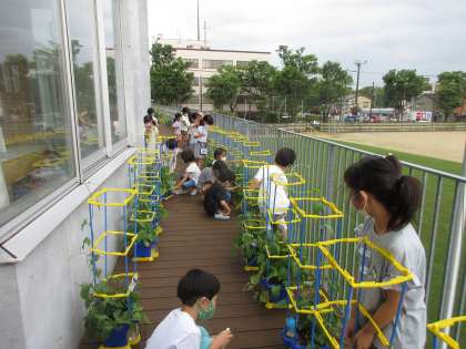 夏休みは各家庭で観察をするために、鉢をパサージュに移動しました。自分の背丈を超えるほどに伸びたつるを支柱に巻き付けて慎重に運びました。
