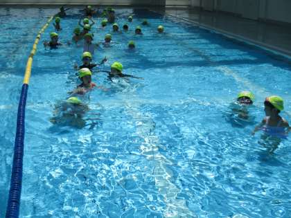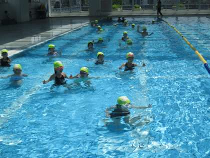 カニさん歩きやカンガルーなどの動物のまねをして、水に親しみました。体の力を抜いて、浮く練習にも挑戦しました。