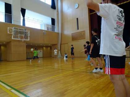体育館で集会をしている様子です。鬼ごっことドッジボールを楽しみました。