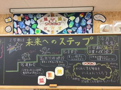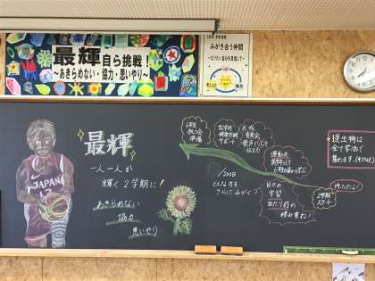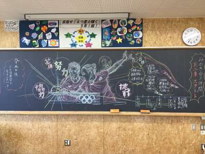 黒板には各担任が、子供たちへのメッセージイラストや言葉で描いていました。