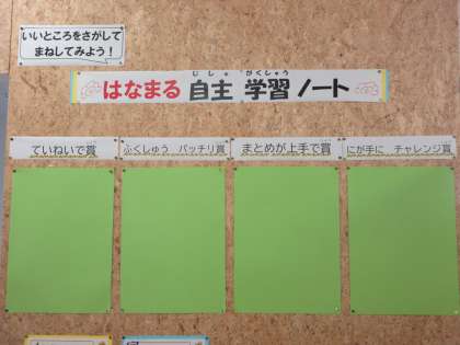 学年の掲示板に、新しい掲示が始まりました。その名も「はなまる自主学習ノート」です。お手本になるノートを掲示したり、達成度を共有したりします。友達のノートを参考にしながら、自分の苦手なところを復習したり、興味があることについて調べてまとめたりして、自分なりのはなまるノートにしていけるといいですね。
