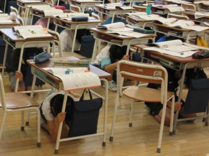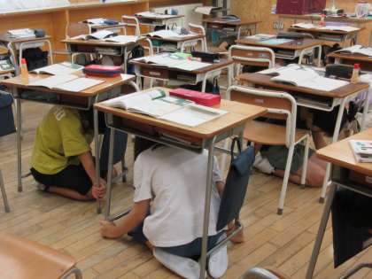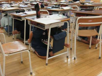 9月1日の防災の日に、避難訓練(シェイクアウト訓練)が行われました。緊急地震速報を聞いて、身を低くしたり机の下に潜ったりするなど、各自が身を守る行動をとる訓練をしました。またいろいろな危険を想像し、どのように身を守るかを教室で考えたりしました。