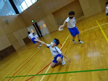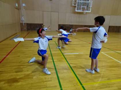 体育科の学習で、音楽を感じて体で表現する運動を行いました。音楽に合わせて手のひらにのせた紙を落とさないように動かしたり、楽しい音楽に合わせて、エアオリンピックをしたりしました。同じ動きでも、音楽を変えると、それに合わせて動き方を変えて工夫していました。