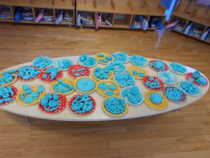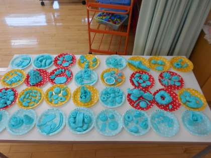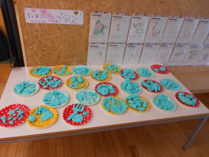 図工では、粘土を丸めたり、伸ばしたり、くるくる巻き付けたりして作品をつくる学習を生かして、ごちそうプレートを完成させました。どの作品も細かいところまでこだわり、本物そっくりで美味しそうです。友達の作品を見合いながら「食べたいな」とつぶやく子供たち。大満足の作品に仕上がりました。