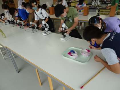 前回も花粉の監察をしましたが、今回は自分で花粉を採取するところから行いました。アサガオ、トウモロコシ、ヘチマ、ホウセンカなど、いろいろな植物の花粉を見比べました。