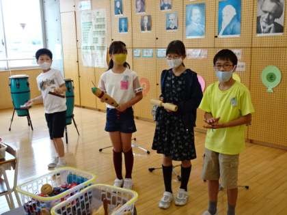 音楽の時間に打楽器を使った学習をしています。楽器の材質の違いに注目して、音の高さ、長さ、音色を聞き比べました。