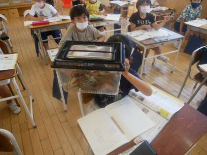 理科では昆虫の身体のつくりを観察しました。実際に子供がつかまえてきたバッタをじっくり観察し、身体のつくりはチョウと同じことを確かめました。