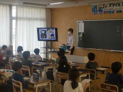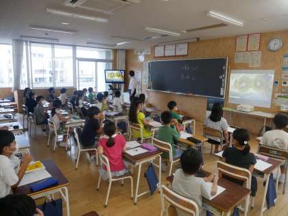 社会科の学習では店で働く人について学習をしています。そこで、ゲストティーチャーをお招きし、普段なかなか見ることのできないバックヤードの様子や見るだけでは分からない裏側の工夫などをとても詳しくお話していただきました。子供たちは、お店の裏側を知ることができ興味津々でした。今日のお話をもとにさらに詳しくお店で働く人について調べたり、考えたりしていきます。