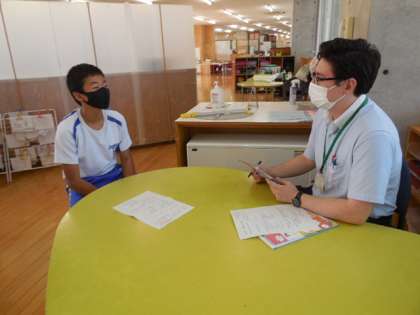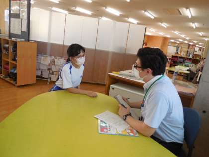 夏休みに行ったところ、したこと、見たこと、食べたもの等、学習した表現を用いてALTと会話をしました。相手の目を見て、ジェスチャーを駆使して、一生懸命伝えようとする姿がすてきでした。