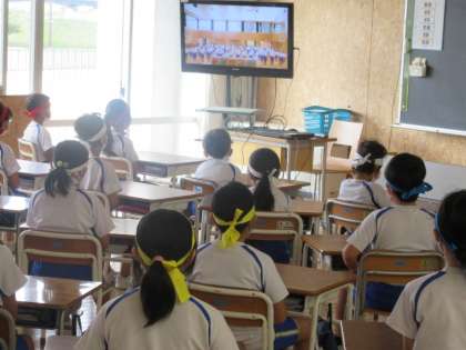 6年生が準備を整え、運動会結団式が行われました。校内テレビ放送では、スローガンの発表、団旗授与、各団からの力強い紹介メッセージが流されました。放送を見つめる全校の子供たちの目からは「がんばるぞ」という決意が表れていました。今日からいよいよ運動会に向かって、全校で心を一つにしていきます。
