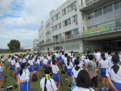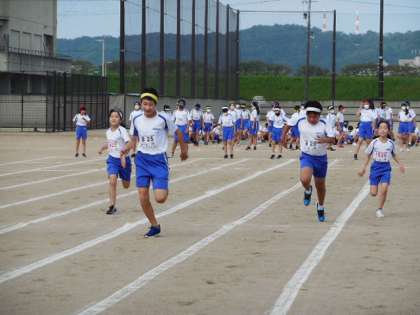 晴天の中、校内陸上記録会を行いました。50m走、走り幅跳び、ソフトボール投げの記録をとりました。写真は、開会式、50m走の様子です。