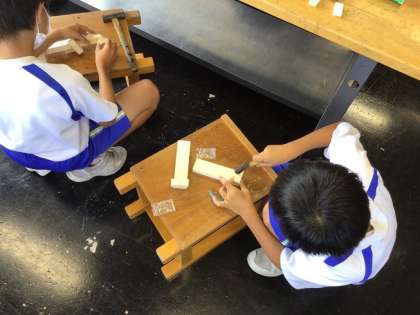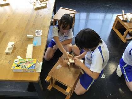 今日は前回の釘の打ち方を確かめながら、どんどん打っていきました。なかなかまっすぐ刺さらず苦戦していましたが、友達と協力しながら作品を仕上げた子供たちです。