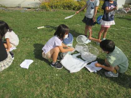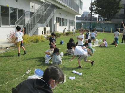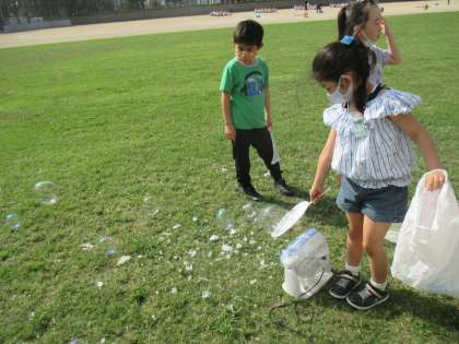 シャボン玉づくりパート3は、芝生の上で行いました。今日が最終回とあって、思い描くシャボン玉を作ろうと、材料や風向きを工夫し、張り切って取り組んでいました。