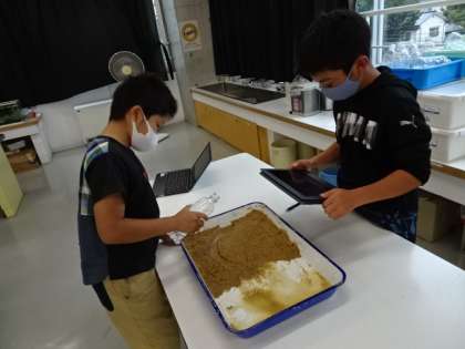 今日は、模型を使って、流れる水のはたらきが大きくなるのはどんな時かを調べました。水の量や流れを変えて実験をして、分かったことを動画で撮影したり、文章を打ち込んだりしてまとめました。