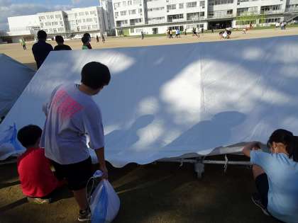 前日準備の様子です。各団のテントを組み立てたり、グラウンドの石拾いをしたりしました。子供たちは自分の仕事に一生懸命取り組んでいました。