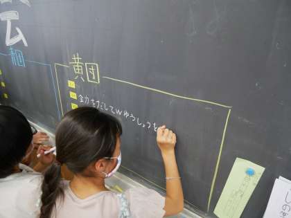 いよいよ明日が運動会になりました。子供たちはどきどき、そわそわ、楽しみ、緊張、様々な気持ちをもちあわせ、少し落ち着かない様子でした。最後に各団の応援の練習をしたり、意気込みを書いたりして、運動会への気持ちを高めていました。