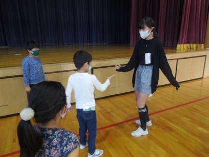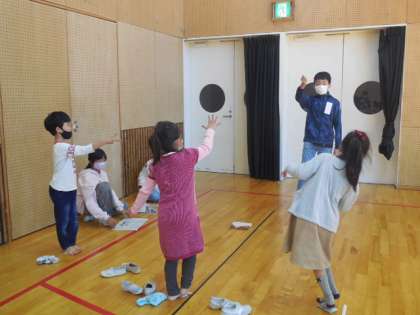 写真は「花いちもんめ」と「新聞じゃんけん」をして遊んでいる様子です。