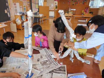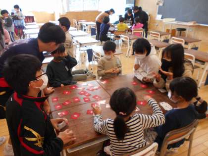 6年生が考えてくださった活動を班ごとに楽しみました。「風船バレー」「へびじゃんけん」「ジェスチャーゲーム」等の身体を使ったゲーム、「トランプ」「思考ゲーム」等の考えながら行うゲーム、「工作」やクロームブックを使って「おえかき」等の想像力を試すゲーム等、アイディアいっぱいの活動を1年生は思いっきり楽しみました。6年生との交流を通して「こんな優しい上級生になりたいな」と憧れの気持ちを抱いている1年生です。