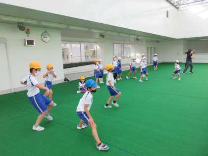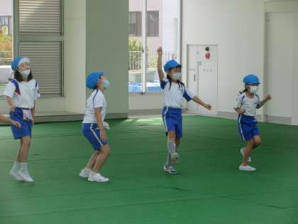 体育科では、曲のリズムにのって踊る学習が始まりました。今日は、先生や代表の友達の真似をしながら、体の様々な部分を動かすことを楽しみました。