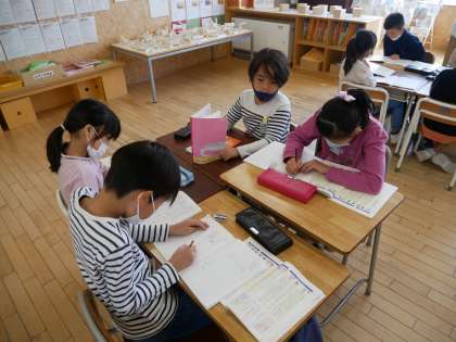 1年生に読み聞かせやお楽しみ会をするために、どんな本を読み聞かせたいか、お楽しみ会ではどんなことをしたいのか考えました。司会や記録、計時等の役割を決め、司会を中心に目的に沿って話し合いました。