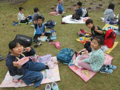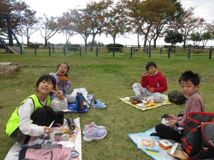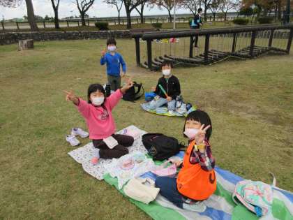水族館を見学後、近くの公園でお弁当を食べました。秋晴れの空の下、みんなで食べるお弁当は特別だったようで、どの子も笑顔いっぱいでした。