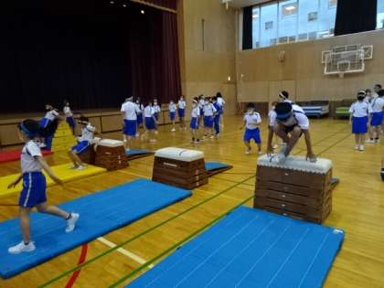 足を閉じたまま跳び箱を跳ぶ、かかえ込み跳びに挑戦しました。子供たちは動画を見て「難しそう」「できるかな」と心配そうにしていましたが、足が引っかからないように真ん中が凹んでいる跳び箱や、二つの跳び箱の間を飛ぶ練習から始めて少しずつ感覚をつかみました。授業が終わる頃にはすっかり上手になりうれしそうな子供たちがたくさんいました。