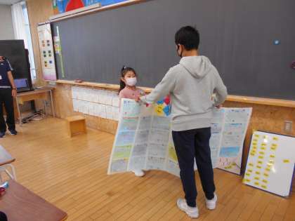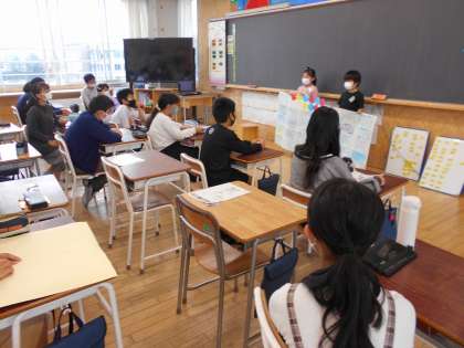 先週、各クラスの6年生縦割りクラスと交流した1年生は、その感謝の気持ちをカードに書いて6年生に届けました。