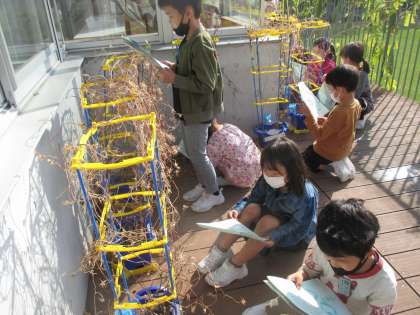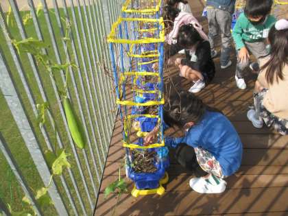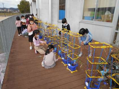 子供たちは種から育てた思い入れあるアサガオとのお別れが名残惜しそうでしたが「たくさん楽しませてくれてありがとう!」「素敵なリースを作るね!」など愛情いっぱいの言葉をかけて、お別れしていました。