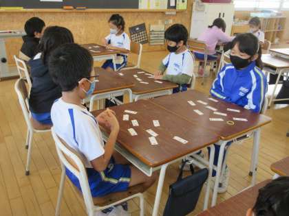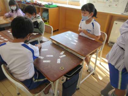 算数科では、かけ算の学習が進んでいます。これまでに5のだんと2のだんを学習しました。九九カードを使って、クイズを出し合ったりカルタゲームをしたりしながら、楽しく九九を覚えています。